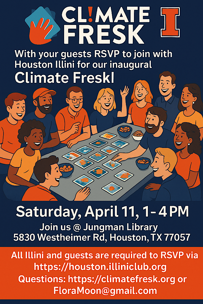 What: Join us at Jungman Library (to be confirmed) on Saturday, April 11 at 1:00 PM for our inaugural Climate Fresk! The Houston Illini Club is excited to host this event as we celebrate Earth Day in April. Climate Fresk is a fun, interactive group card game that leverages players’ knowledge to help participants learn about climate science. The game requires no prior knowledge and is accessible and engaging for all. This hands-on approach avoids overwhelming data and clarifies complex topics.