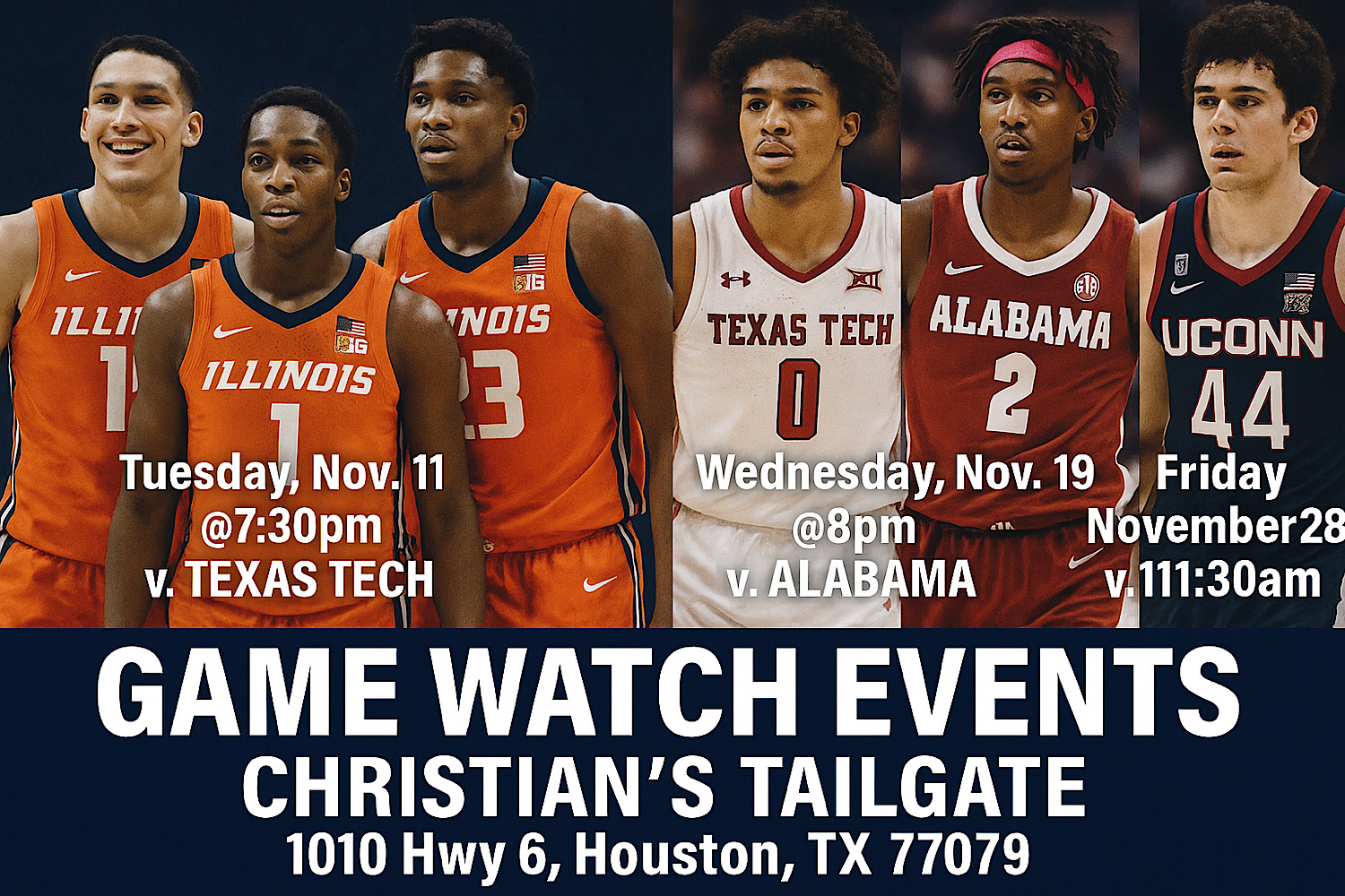 Join us at Christian’s Tailgate on Tuesday. Nov 11 7:30 PM for Illinois vs. Texas Tech 🏀!