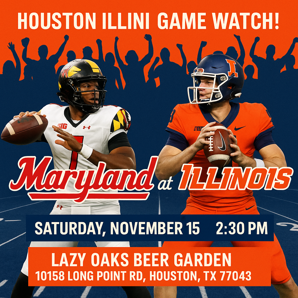 Fellow Illini, with your friends and family join Houston Illini for Maryland vs. Illinois football game watch at Lazy Oaks on Saturday, Nov 15 at 2:30 pm -