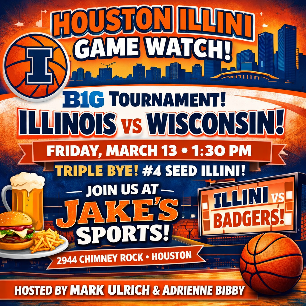 1:30PM - 4:00PM Fri 13 Mar 2026 Central timezoneJoin us at Jake’s on Friday, 3/13 at 1:30 pm for Illinois in the B1G Tournament! 🏀 -